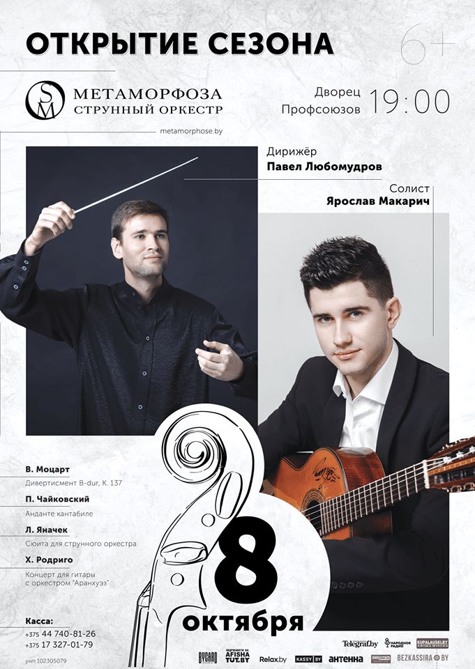8 октября 2019 г. струнный оркестр «Метаморфоза» под управлением Павла Любомудрова открывает свой пятый концертный сезон на сцене Дворца профсоюзов вместе с блистательным молодым белорусским гитаристом Ярославом Макаричем.